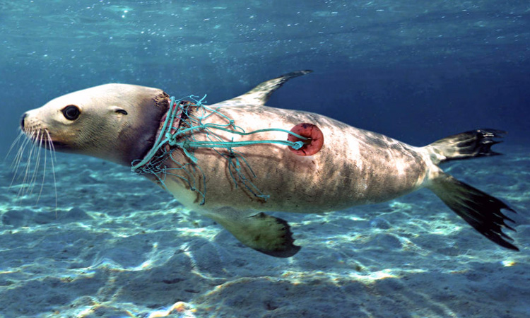 Neylon ip va bo‘yniga o‘ralgan baliq to‘ri bo‘laklari bilan yaralangan dengiz sheri suzmoqda