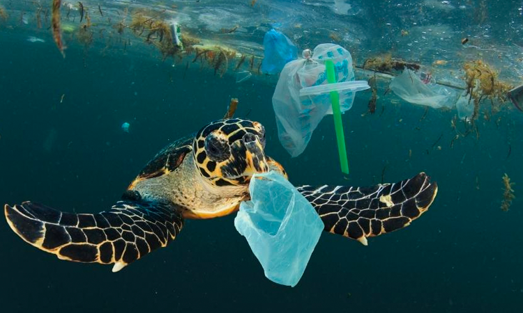 Plastik chiqindilar orasida suzib yurgan toshbaqa